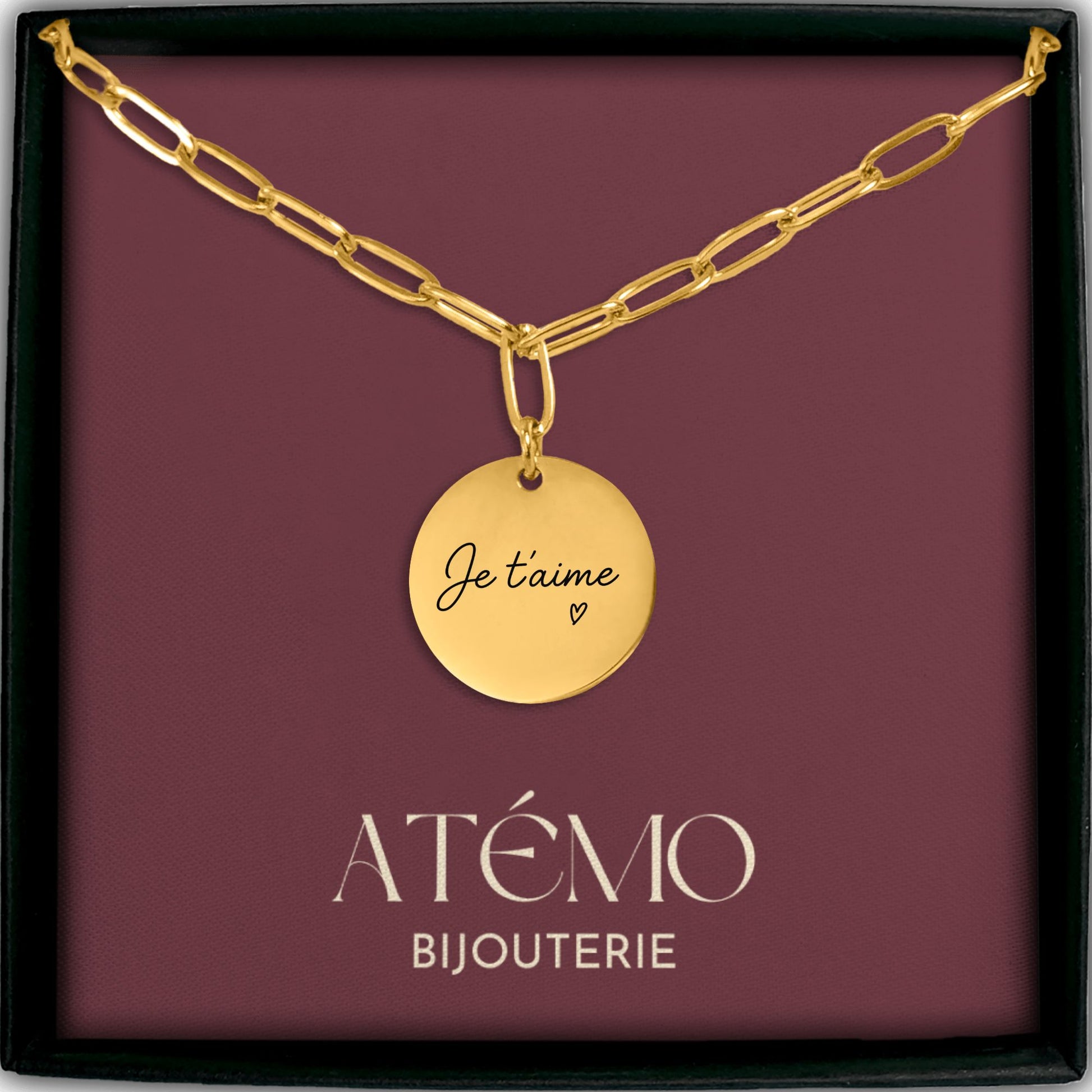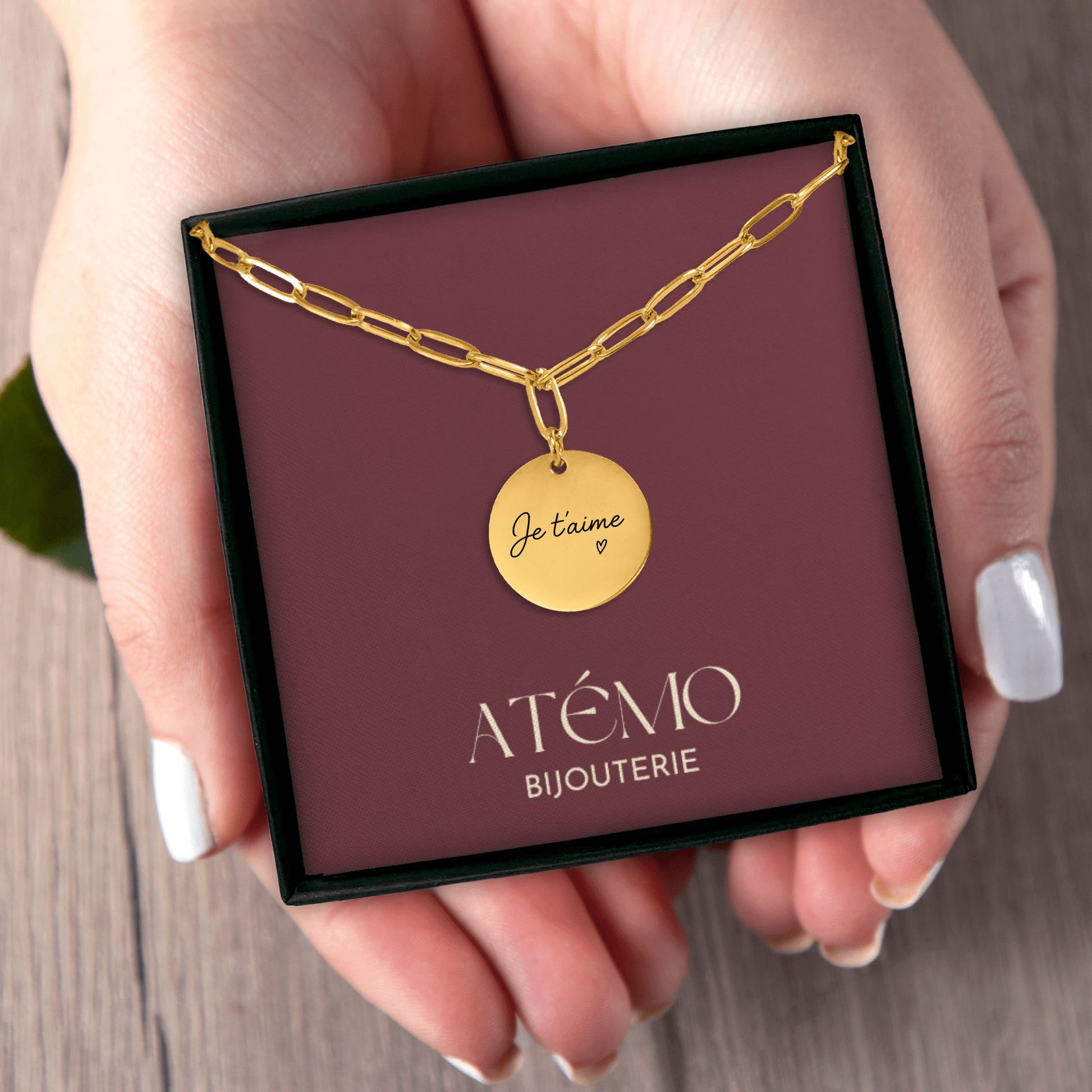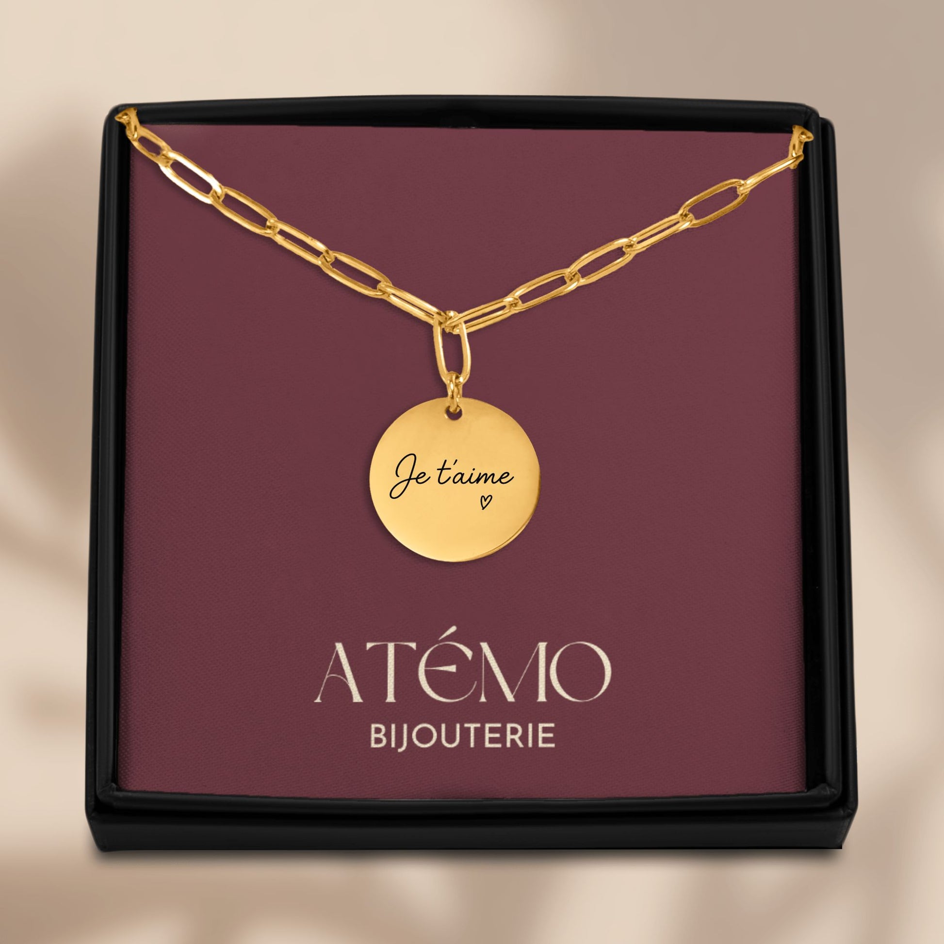 Collier disque avec message manuscrit gravé| Chaîne trombone